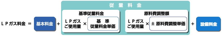 LPガス料金は、ガスの使用量とは関係なく一定額を毎月お支払いいただく「基本料金」、LPガスの使用量に応じてお支払いいただく料金「従量料金」と当社所有の消費設備等がある場合に、金額に応じてお支払いいただく「設備利用料」を合計した金額がご請求金額となっています。