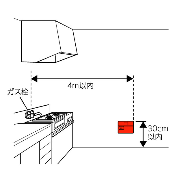 〇床面から30cm以内の高さで、ガス器具やガス栓の最も遠いところより水平で距離で4m以内の場所へ取り付けてください。