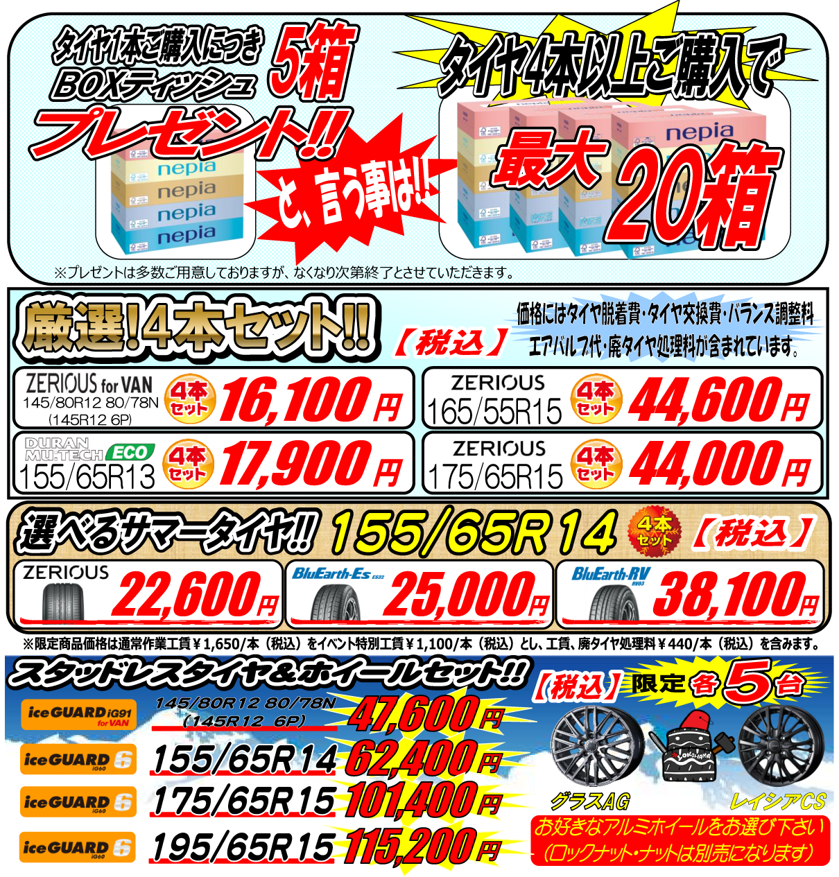 弊社SSでは、安心快適ドライブができるタイヤを特別価格でご提供!